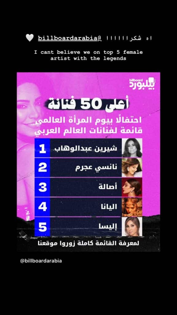 Amongst the roster of household names, Elyanna is joined by Sherine Abdel-Wahab, who secured Top 1, followed by Nancy Ajram, Assala, and Elissar Zakaria Khoury, respectively (literal icons).