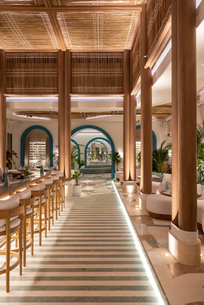 The redesign is chic without trying too hard, which is kind of Nammos’ whole thing. Lush greenery and striped pathways set the tone before you even reach the terrace. The design blurs the line between inside and out, bringing Cycladic architecture straight to Jumeirah. Think turquoise touches, Greek arches, soft coastal light and floors with hand-painted details that make you want to stop for a quick candid.