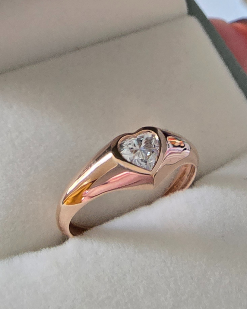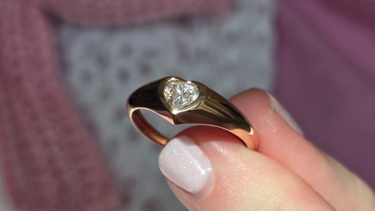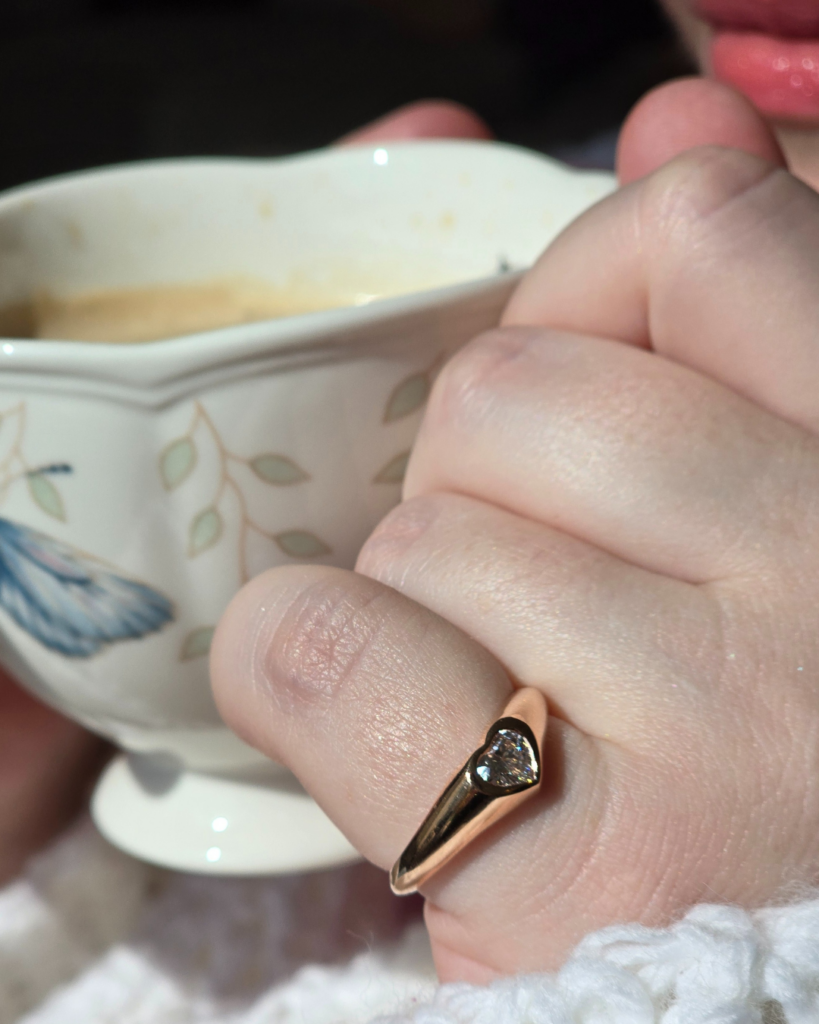 The Heart of Hope Lauren diamond pinky ring is a half carat heart-shaped lab diamond (F Colour, VS Clarity) ring set in 18 karat gold with a ribbon engraving inside the band. I loved the concept of the pinky ring from the start.